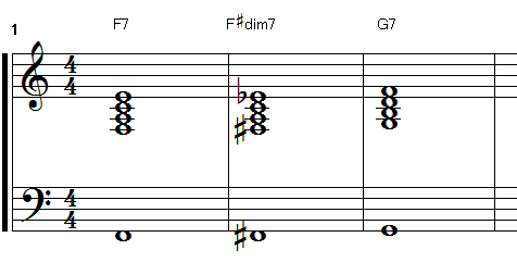メジャー・キーにおける「Ⅳ⇒#Ⅳdim⇒Ⅴ」のコード進行は、サブドミナントから、ルート音が半音上のパッシング・ディミニッシュを経て、ルート音が更に半音上のドミナントへ進行するコード進行である。